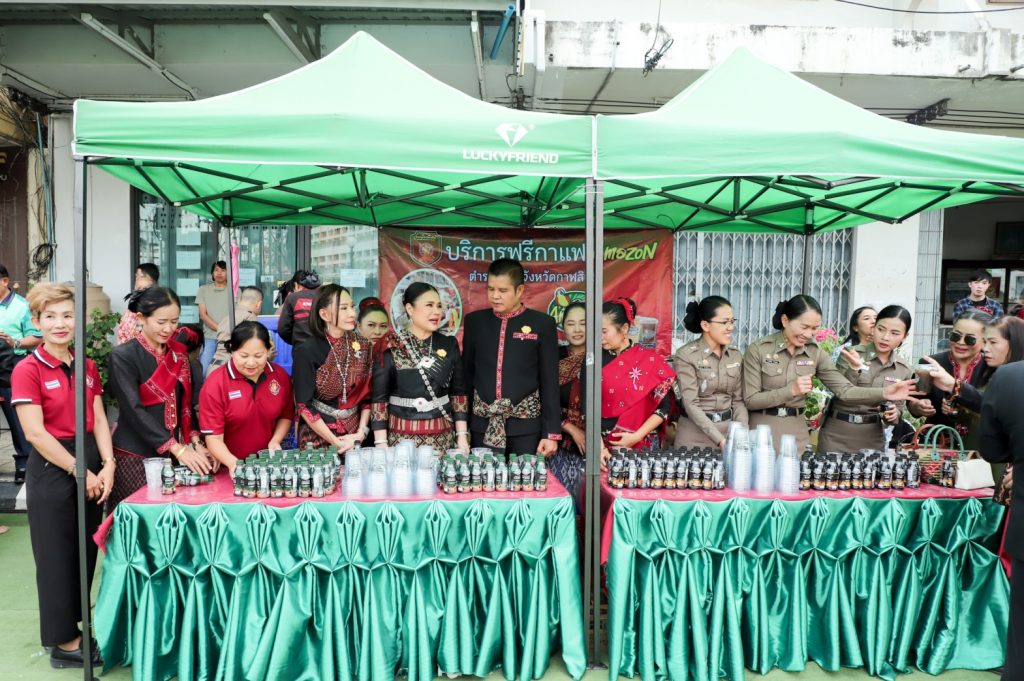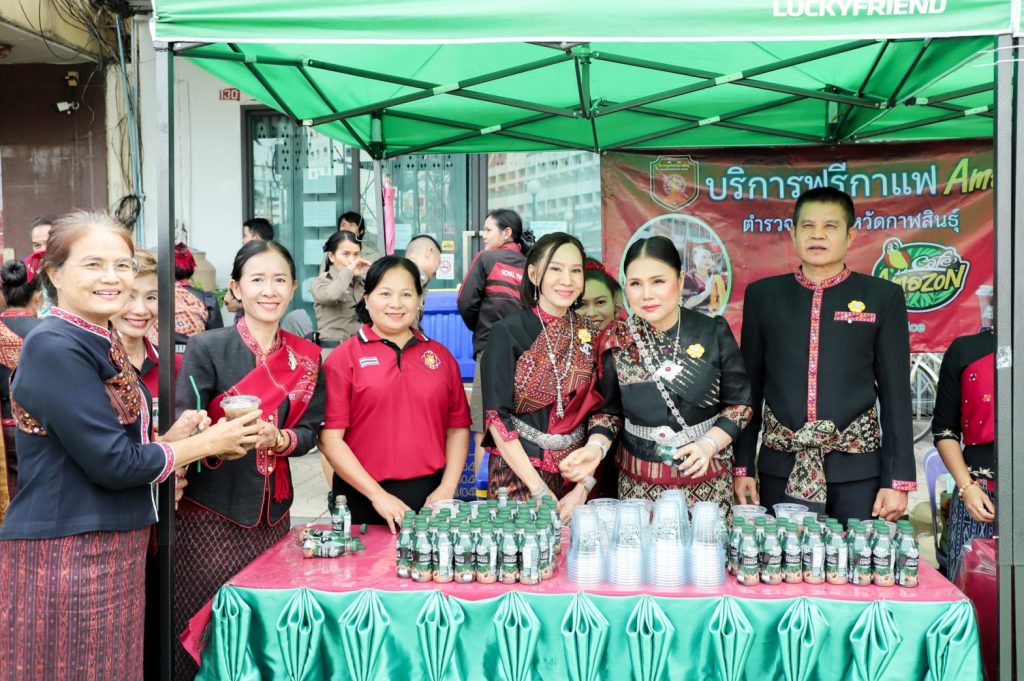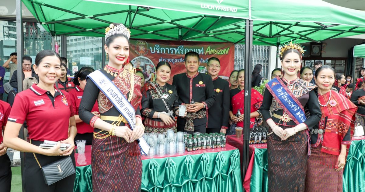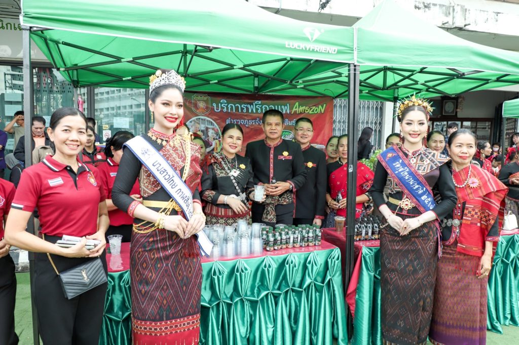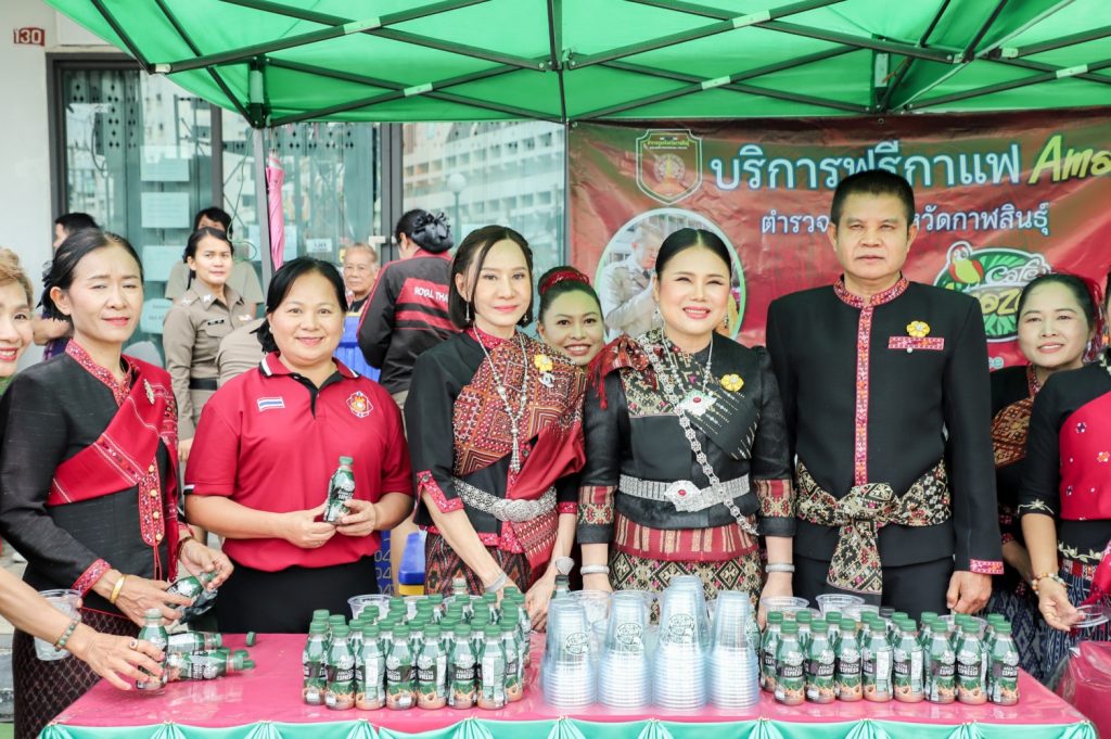 พล.ต.ต.ศิรสัณห์ เยื้อนสงวนชัย ผบก.ภ.จว.กาฬสินธุ์ คุณจุรีพร สินธุไพร ประธานแม่บ้าน ภ.จว.กาฬสินธุ์ พ.ต.อ.สมพงศ์ มั่นหมาย รอง ผบก.ภ.จว.กาฬสินธุ์ คุณไอรินทร์ มั่นหมาย รองประธานแม่บ้านฯ พร้อมคณะแม่บ้านตำรวจ จัด “บริการฟรีกาแฟ Amazon” ให้กับผู้เข้าร่วมในงานพิธีบวงสรวงอนุสาวรีย์พระยาชัยสุนทร และงานเทศกาลมหัสจรรย์กาฬสินธุ์เมืองล้านธุง ประจำปี 2568 ที่บริเวณอนุสาวรีย์พระยาชัยสุนทร