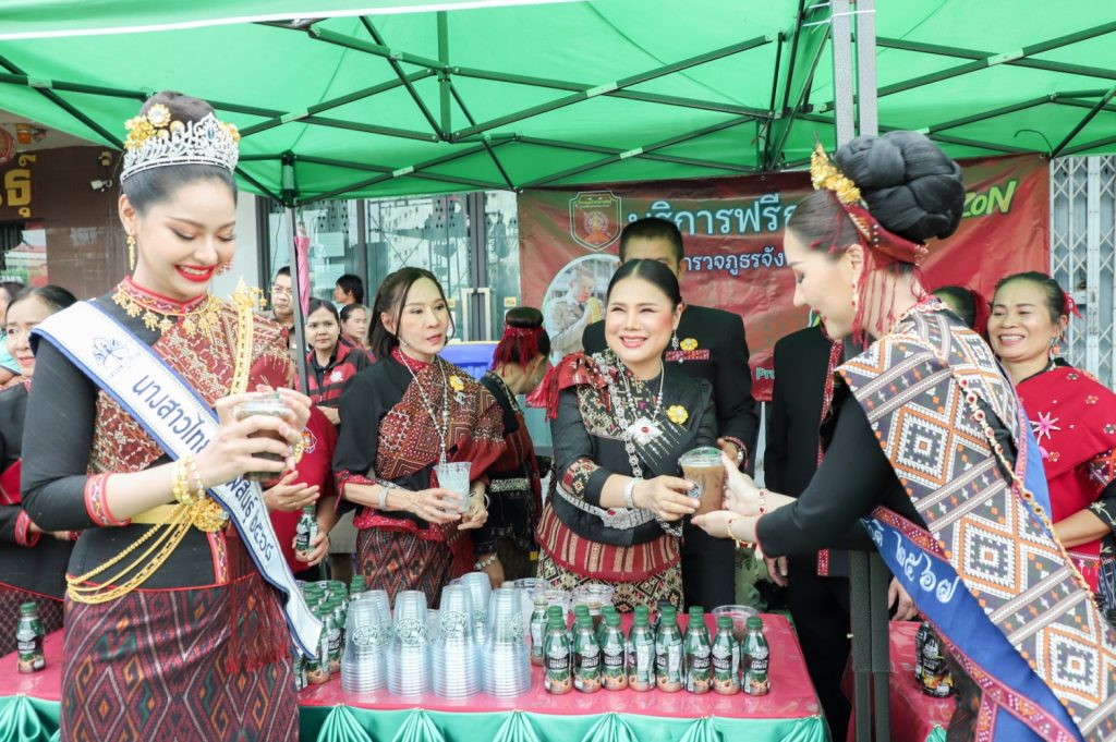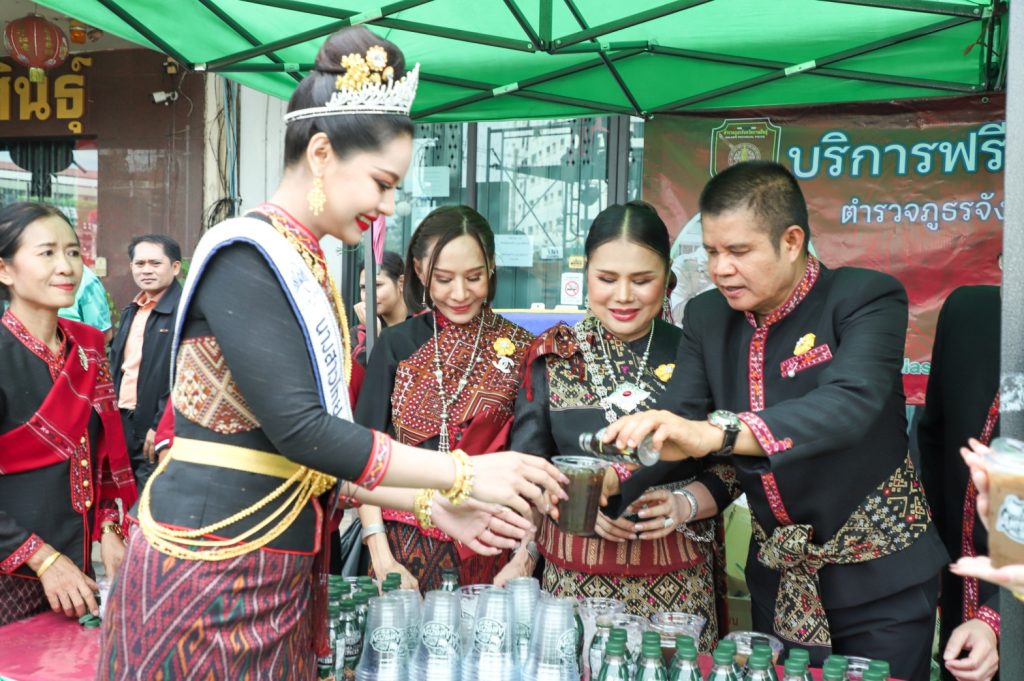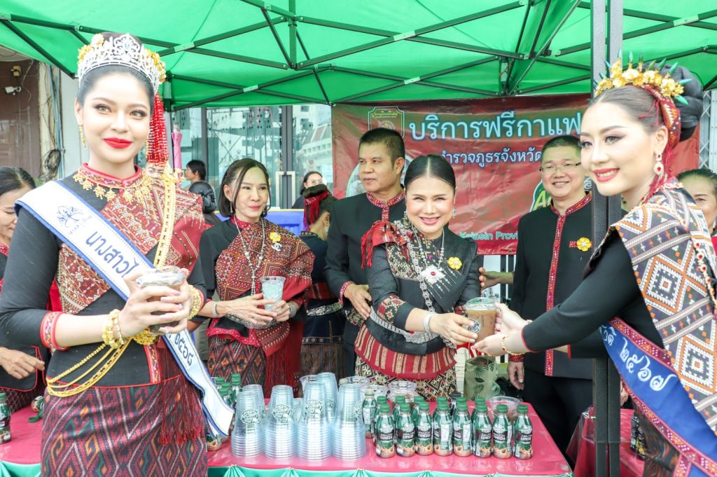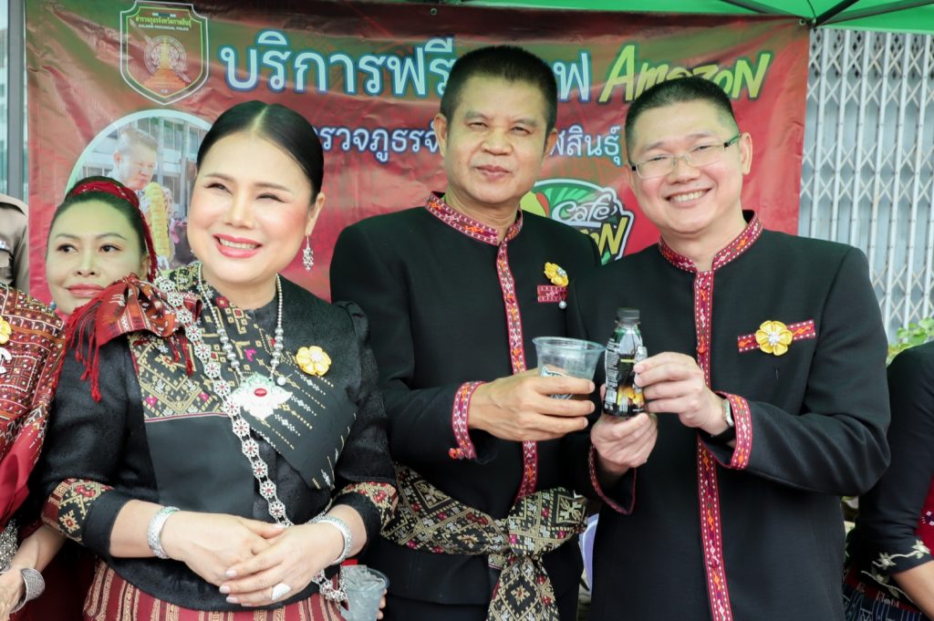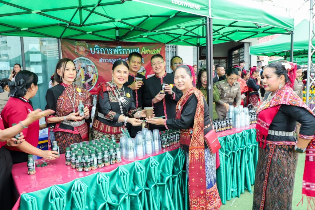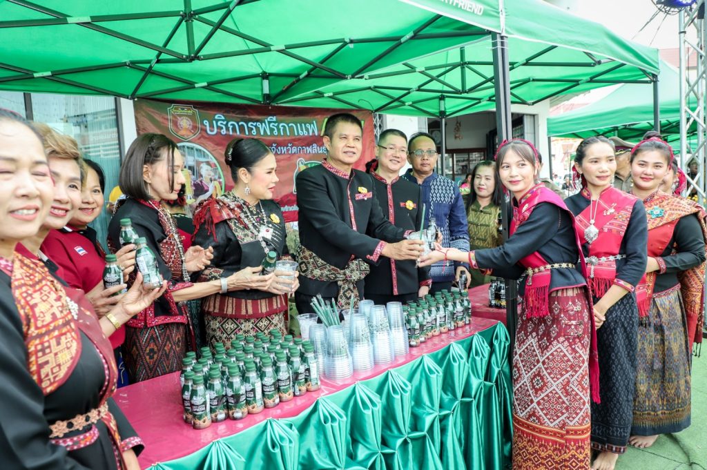 พล.ต.ต.ศิรสัณห์ เยื้อนสงวนชัย ผบก.ภ.จว.กาฬสินธุ์ คุณจุรีพร สินธุไพร ประธานแม่บ้าน ภ.จว.กาฬสินธุ์ พ.ต.อ.สมพงศ์ มั่นหมาย รอง ผบก.ภ.จว.กาฬสินธุ์ คุณไอรินทร์ มั่นหมาย รองประธานแม่บ้านฯ พร้อมคณะแม่บ้านตำรวจ จัด “บริการฟรีกาแฟ Amazon” ให้กับผู้เข้าร่วมในงานพิธีบวงสรวงอนุสาวรีย์พระยาชัยสุนทร และงานเทศกาลมหัสจรรย์กาฬสินธุ์เมืองล้านธุง ประจำปี 2568 ที่บริเวณอนุสาวรีย์พระยาชัยสุนทร