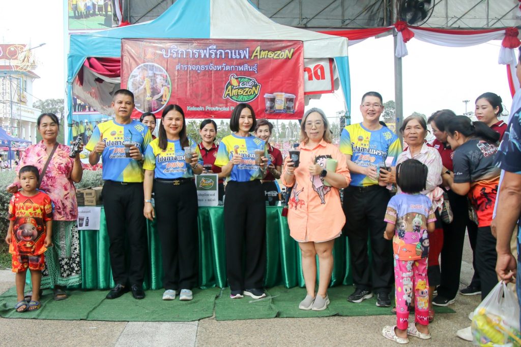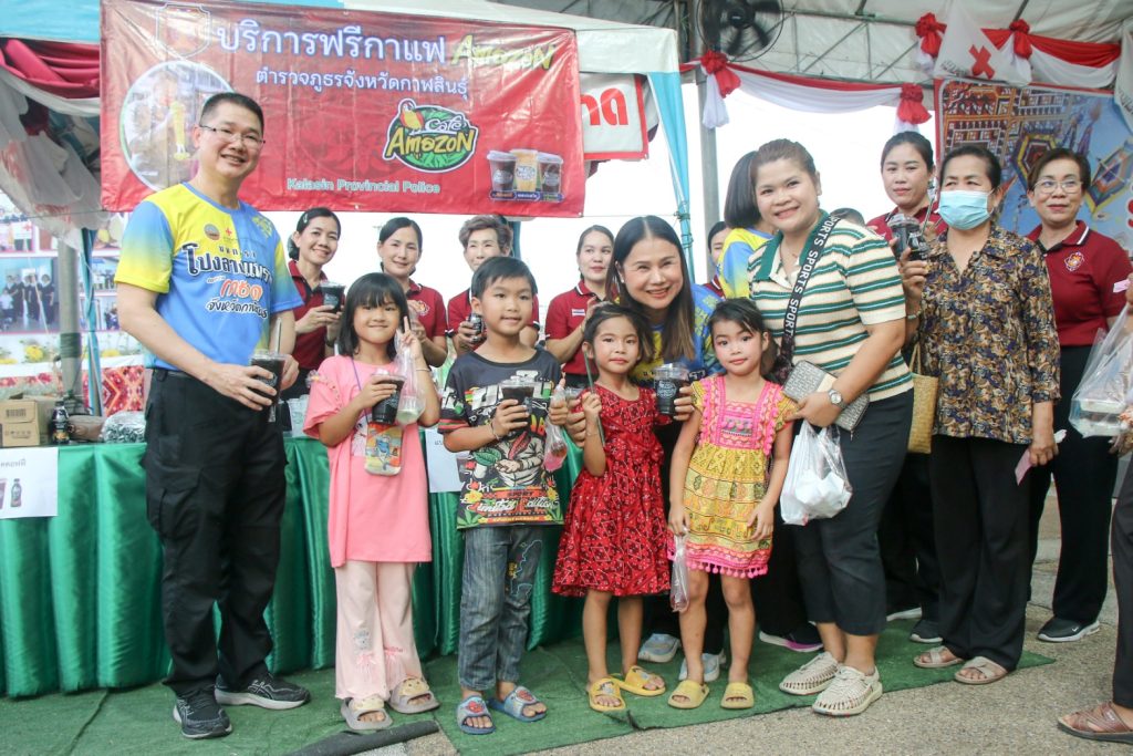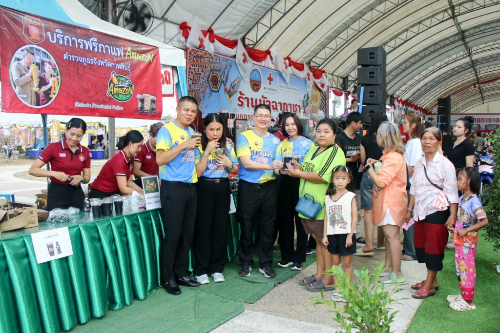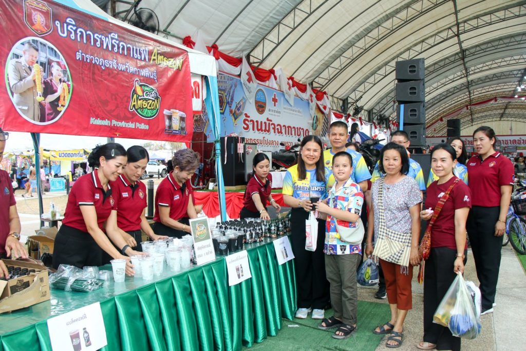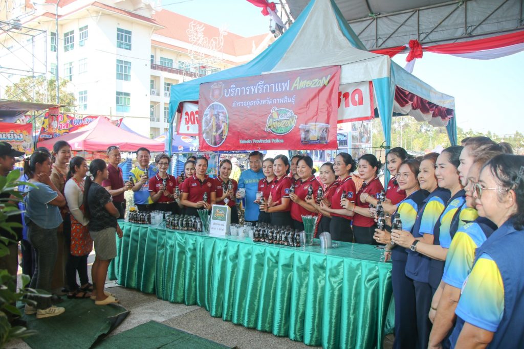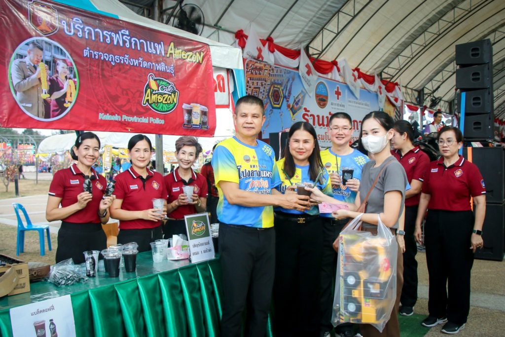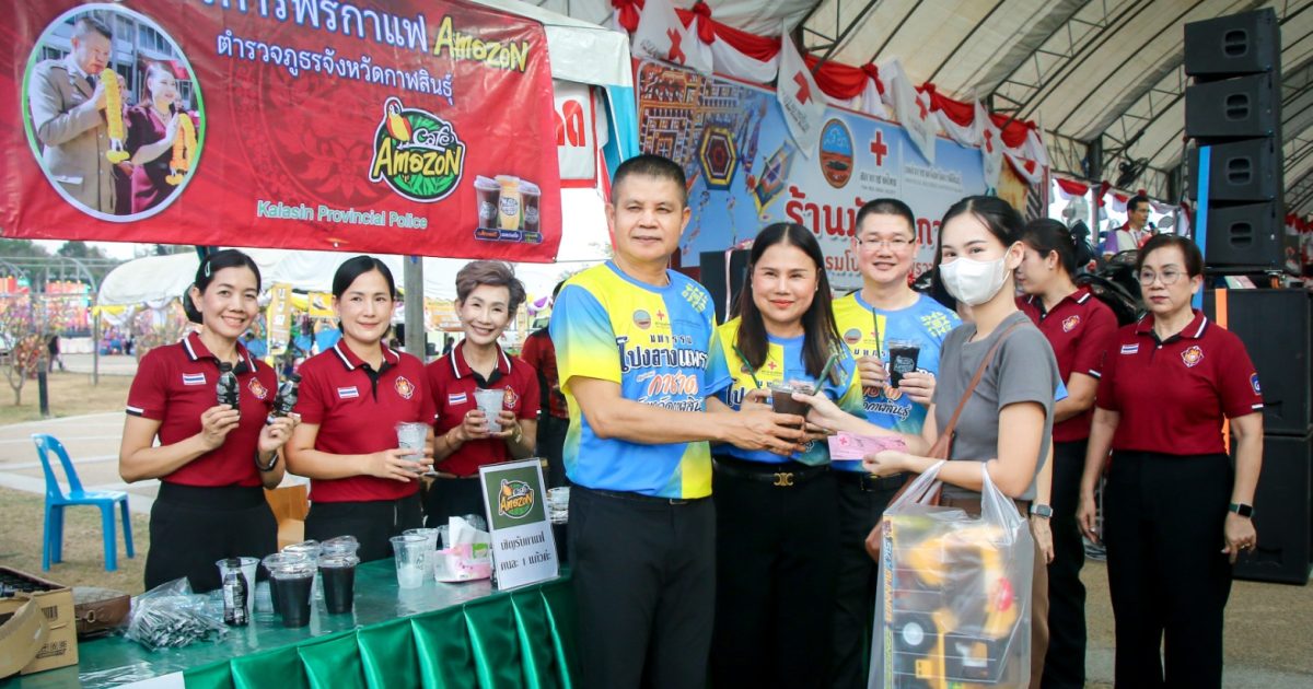 พล.ต.ต.ศิรสัณห์ เยื้อนสงวนชัย ผบก.ภ.จว.กาฬสินธุ์ คุณจุรีพร สินธุไพร ประธานแม่บ้าน ภ.จว.กาฬสินธุ์ พ.ต.อ.สมพงศ์ มั่นหมาย รอง ผบก.ภ.จว.กาฬสินธุ์ คุณไอรินทร์ มั่นหมาย รองประธานแม่บ้านฯ พร้อมคณะแม่บ้านตำรวจ จัด “บริการฟรีกาแฟ Amazon” ให้กับเจ้าหน้าที่ผู้ปฎิบัติหน้าที่ประจำร้านมัจฉากาชาด และประชาชนทั่วไปที่มาเที่ยวงาน “มหกรรมโปงลาง แพรวา และงานกาชาด จังหวัดกาฬสินธุ์ ประจำปี 2568 ระหว่างวันที่ 26 กุมภาพันธ์ – 9 มีนาคม 2568 ณ บริเวณสนามหน้าศาลากลาง ศูนย์ราชการจังหวัดกาฬสินธุ์