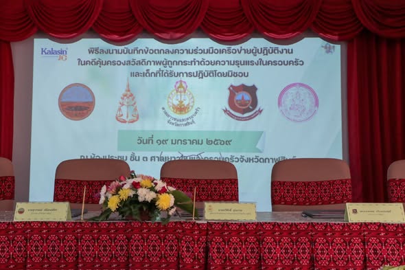 นายสุวรรธณ์ เข็มธนเพ็ชร ผู้ว่าราชการจังหวัดกาฬสินธุ์ พล.ต.ต.ทรงพล บริบาลประสิทธิ์ ผบก.ภ.จว.กาฬสินธุ์ นายทวีศักดิ์ สุรนารถ ผู้พิพากษาหัวหน้าศาลเยาวชนและครอบครัวจังหวัดกาฬสินธุ์ และหน่วยงานที่เกี่ยวข้อง ร่วมลงนามใน พิธีลงนามบันทึกข้อตกลงความร่วมมือเครือข่ายผู้ปฏิบัติงานในคดีคุ้มครองสวัสดิภาพผู้ถูกกระทำด้วยความรุนแรงในครอบครัวและเด็กที่ได้รับการปฏิบัติโดยมิชอบ และลงนามบันทึกข้อตกลงการส่งเสริมสนับสนุนและประสานความร่วมมือด้านก่ารจัดการตามหมายจับ(แบบพิมพ์ 47)” พ.ต.อ.ชุมพล หันชะนา รอง ผบก.ภ.จว.กาฬสินธุ์ พ.ต.อ.สุธน สีหามาตย์ พ.ต.อ.สุกนต์ธี ศรีอารยพงษ์ ผกก.(สอบสวน) กลุ่มงานสอบสวนฯ ศาลจังหวัดกาฬสินธุ์ อัยการจังหวัดกาฬสินธุ์ หน่วยงานที่เกี่ยวข้องร่วมเป็นเกียรติและสักขีพยาน ณ ห้องประชุมชั้น 3 ศาลเยาวชนและครอบครัวจังหวัดกาฬสินธุ์ 19 ม.ค.2569 เวลา 10.00 น.