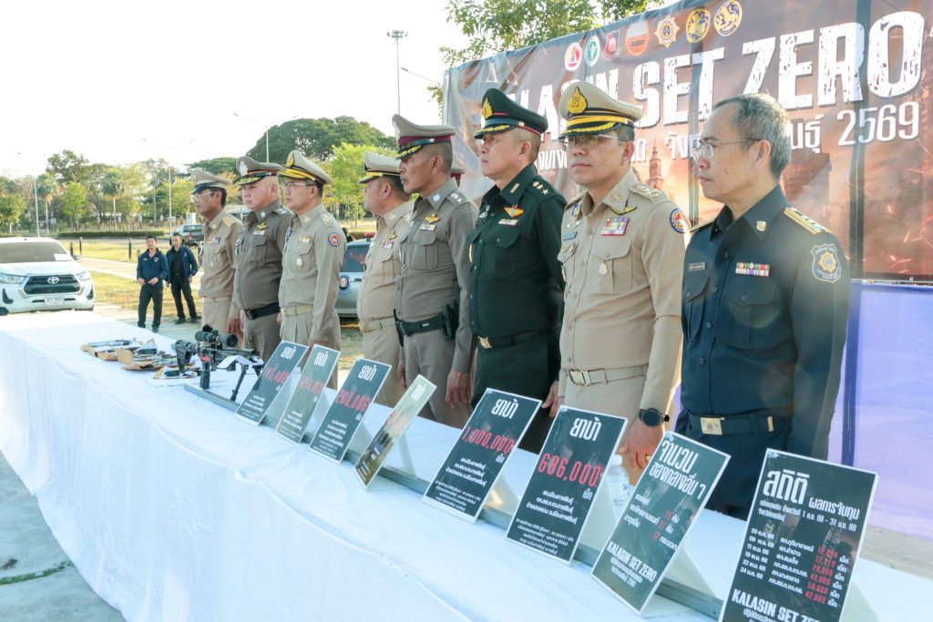 นายสุวรรธณ์ เข็มธนเพ็ชร ผู้ว่าราชการจังหวัดกาฬสินธุ์ พล.ต.ต.ทรงพล บริบาลประสิทธิ์ ผบก.ภ.จว.กาฬสินธุ์ พ.ต.อ.นพดล ศรีชะตา รอง ผบก.ภ.จว.กาฬสินธุ์ พ.ต.อ.นพวิทย์ ดิษฐาธนาธรสิริ ผกก.สส.ภ.จว.กาฬสินธุ์ พ.ต.อ.ชลิต ศรีหานู ผกก.สภ.เมืองกาฬสินธุ์ พร้อมด้วย ผกก.ฯ สว.ฯ หัวหน้าสถานีตำรวจในสังกัด กำลังพลตำรวจ ชุด SAWAT กก.สส.ภ.จว.กาฬสินธุ์ สภ.เมืองกาฬสินธุ์ และหน่วยงานที่เกี่ยวข้องในจังหวัดกาฬสินธุ์ ร่วมแถลงข่าวผลการจับกุมกุมคดียาเสพติด ในห้วง 1 ตุลาคม 2568 -31 มกราคม 2569จับกุมคดียาเสพติดได้ ทั้งสิ้น 1,666 คดี / ผตห.1666- ยึดยาบ้า 4,057,300 เม็ด ยึดทรัพย์มูลค่ารวม 19,701,076 บาท คดีสมคบผลดำเนินการ 27 คดี โครงการตำบลยั่งยืนแก้ไขปัญหายาเสพติดตามยุทธศาสตร์ชาติ 2569 ดำเนินการ ในพื้นที่ 23 สภ. จำนวน 46 ชุมชมชนหมู่บ้าน ตามโยบายสำนักงานตำรวจแห่งชาติ ( 5 ก.พ. 2569 เวลา 17.00 น. )